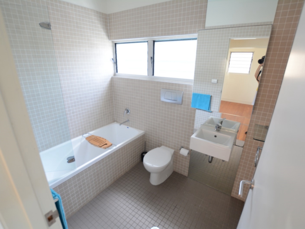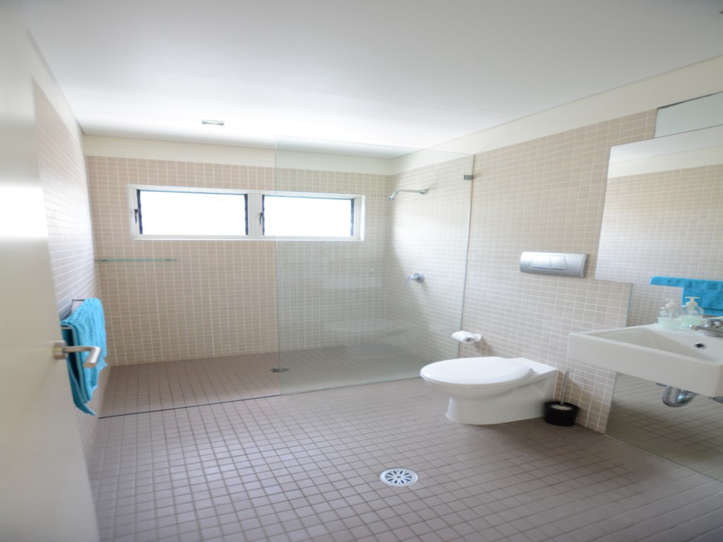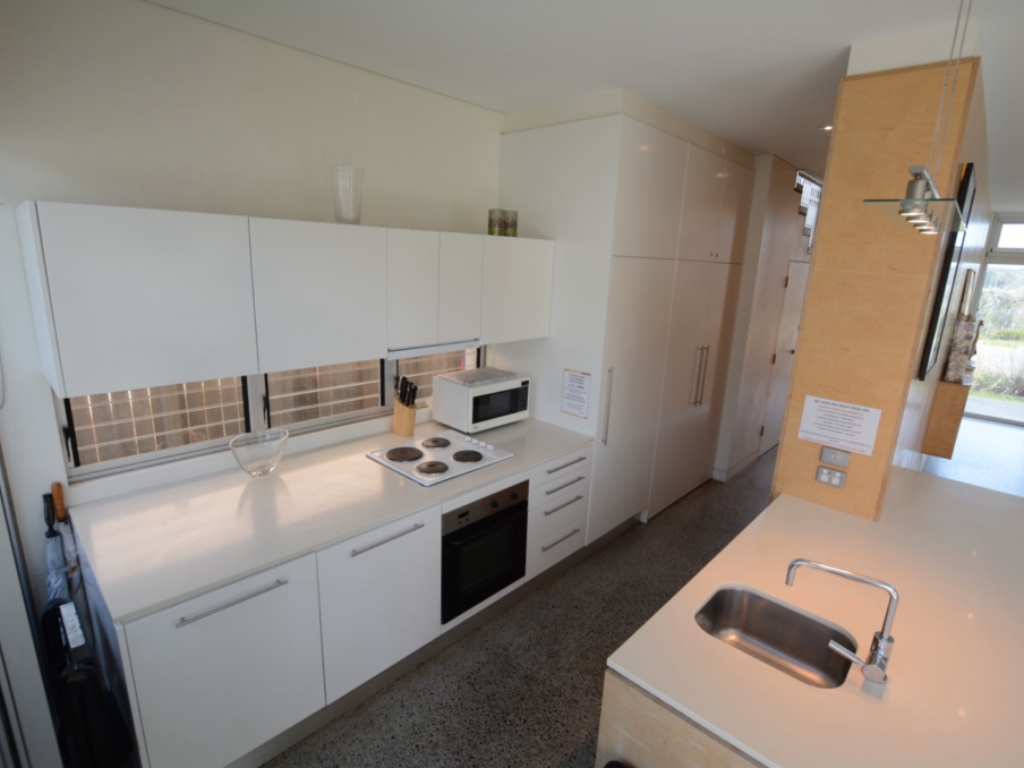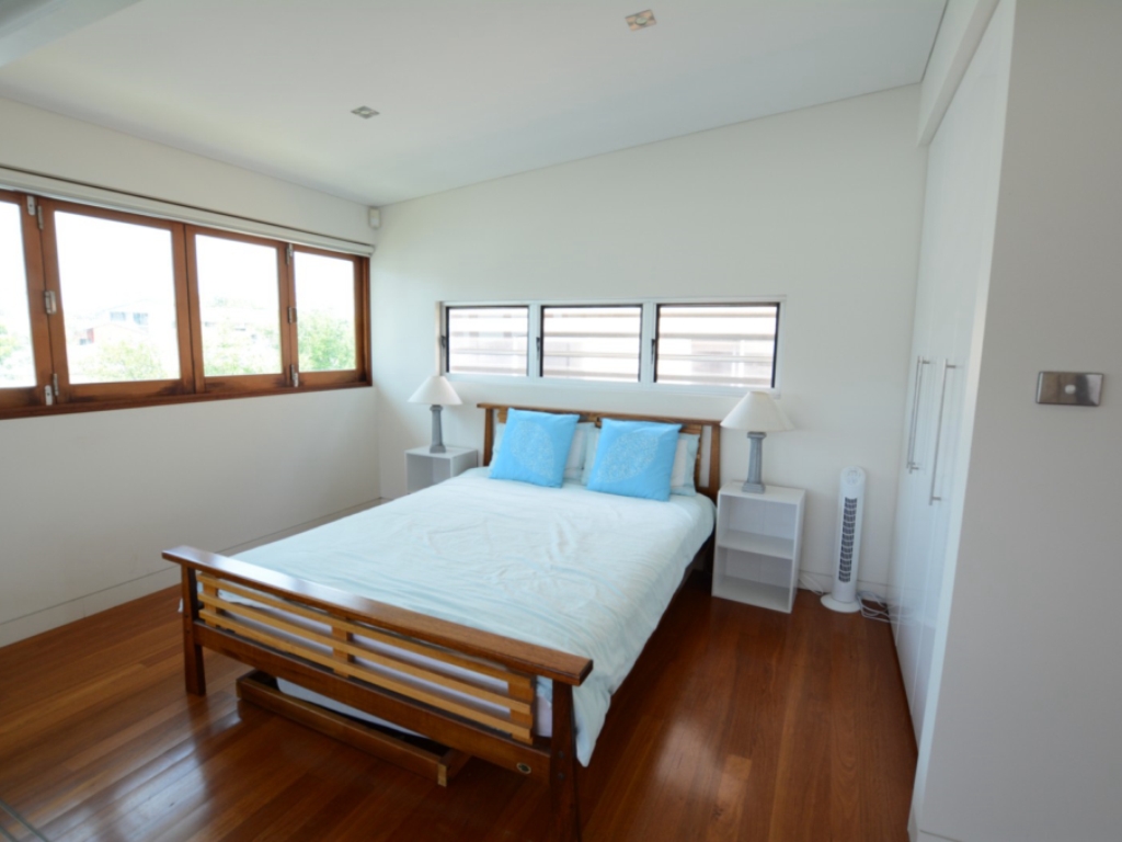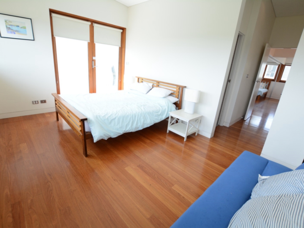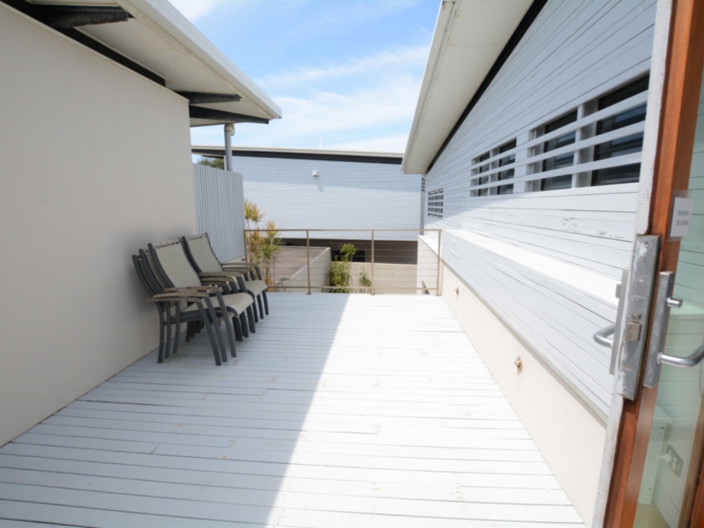 Open up the glass sliding doors leading off the kitchen & dining into the courtyard. Upstairs enjoy spectacular ocean views from the main bedroom and private deck which also overlooks the reserve directly across the road. The second bedroom has a retractable wall between it and the third bedroom, allowing for one big kids room or separate accommodation for two families, you decide.